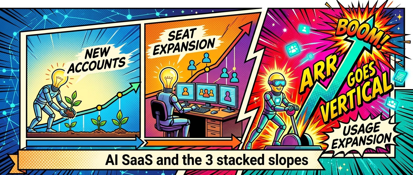 Because AI SaaS often compounds across three slopes at the same time. If you look at ARR graphs, how do they grow? There are 3 levers.
